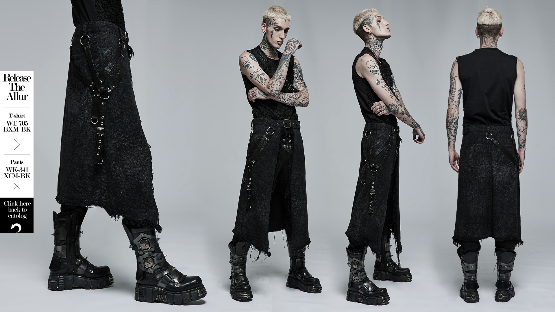 1.Man kilt made of dark textured printed fabric. 2. The belt can be adjusted according to waist size. 3. The aging effect is made through water washing process. 4. The right side is decorated with a leather loop, which is detachable.