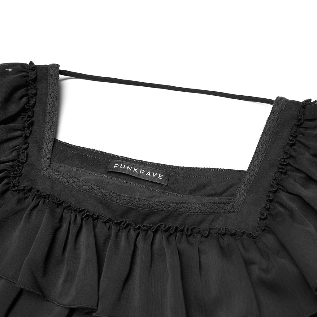 1. Ruffled Vintage square collar. 2. Detachable bow brooch. 3. Soft crepe combines strip lace. 4. Loose A line.