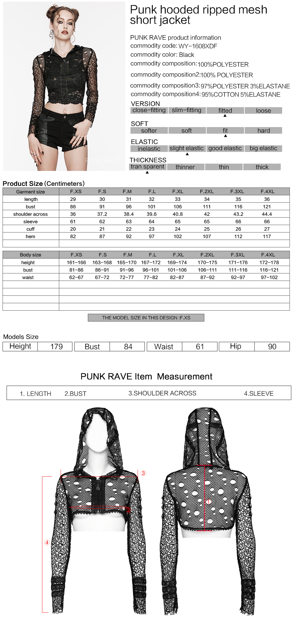 Punk Rave WY-1608XDF Short Hooded Design Punk Hooded Ripped Mesh Short Jacket