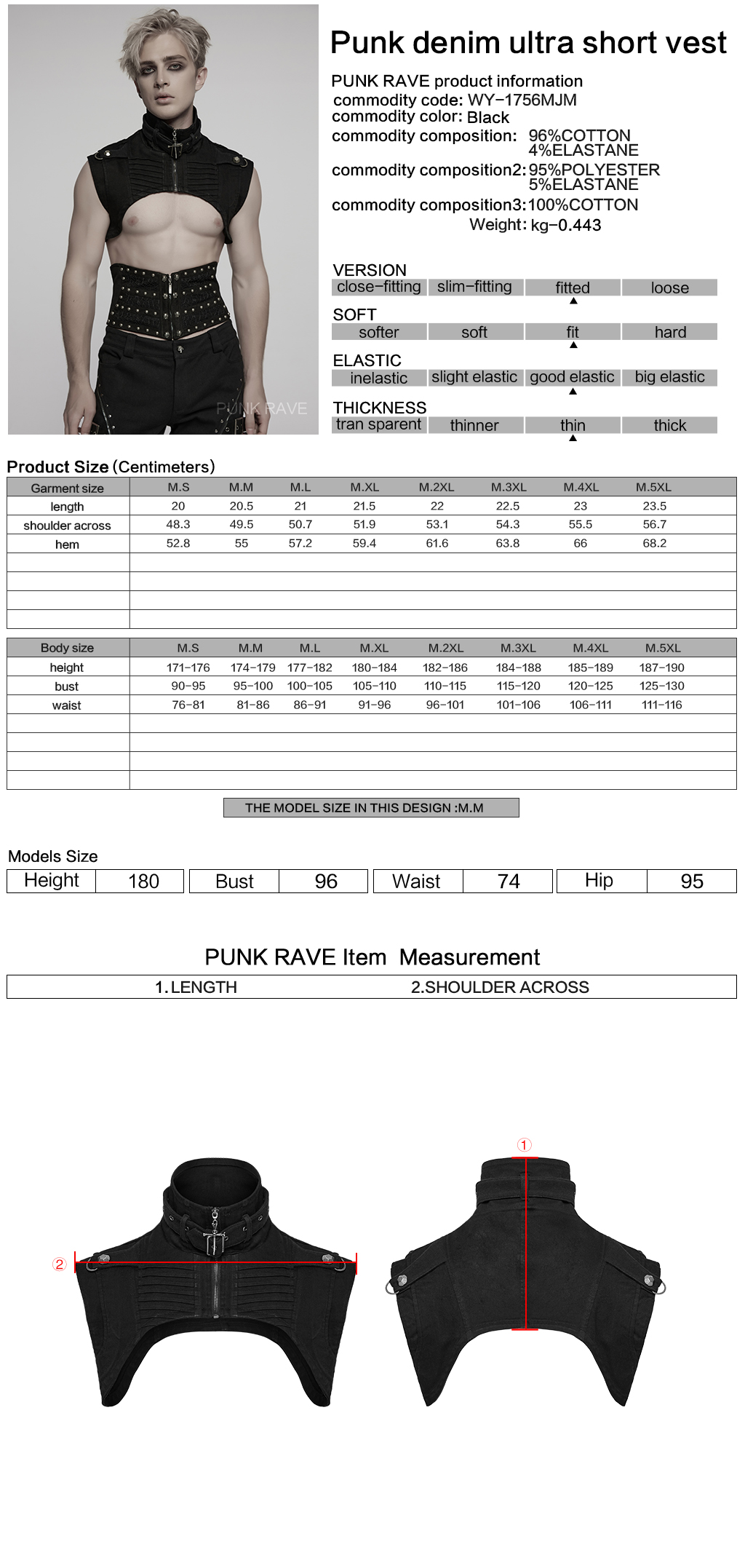 Punk Rave WY-1756MJM Stand Collar And Unique Silhouette Design Punk Denim Ultra Short Vest