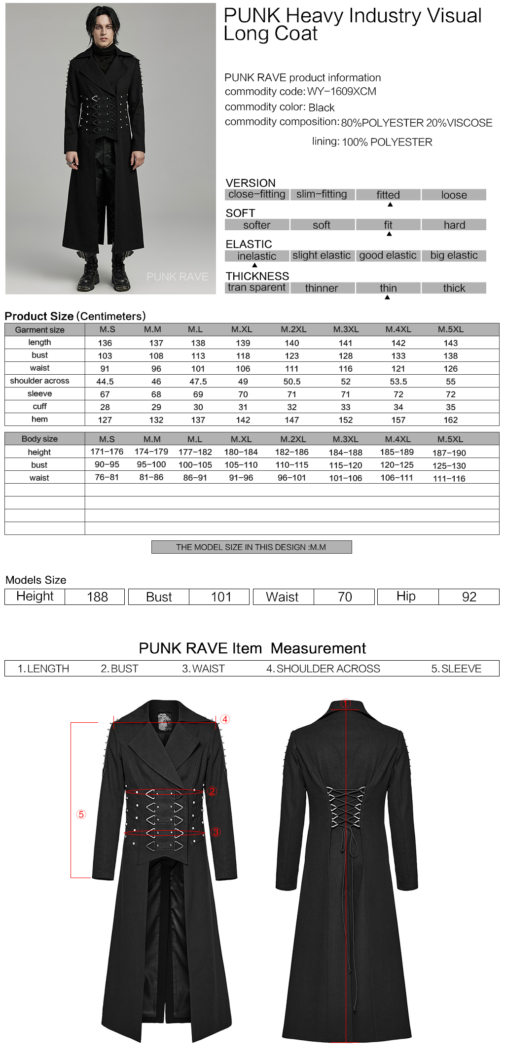 Punk Rave WY-1609XCM Triangle Buckles Spikes Decoration Stand-Up Collar Punk Heavy Industry Visual Long Coat