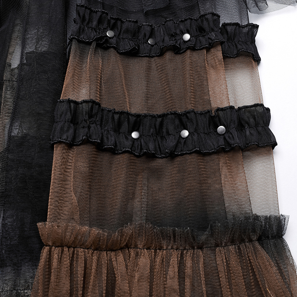 1. Gradient color mesh fabric 2. Rich layers and asymmetrical staggered skirt design 3. Punk crackled faux leather belt 4. Three colors available