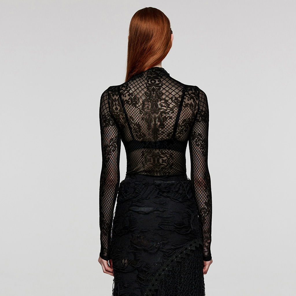 Punk Rave Gothic Mystery Custom Printed Flocked Pattern Elastic Flocked Mesh Fabric Goth T-Shirt