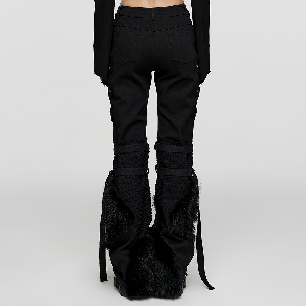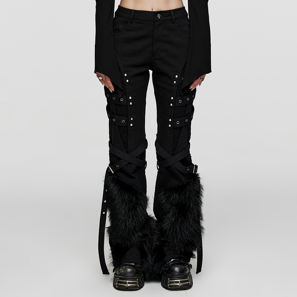 1 Elastic twill and mesh and faux wool fabric 2 Rich split design at the thigh 3 Detachable knee loops 4 Faux fur on both sides add punk style