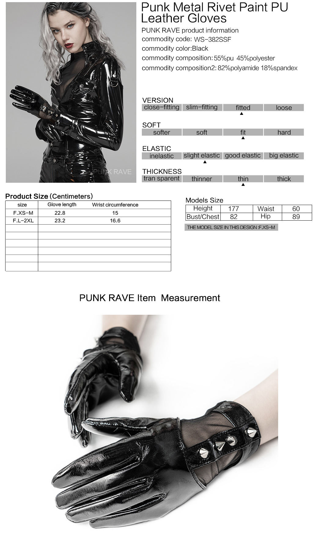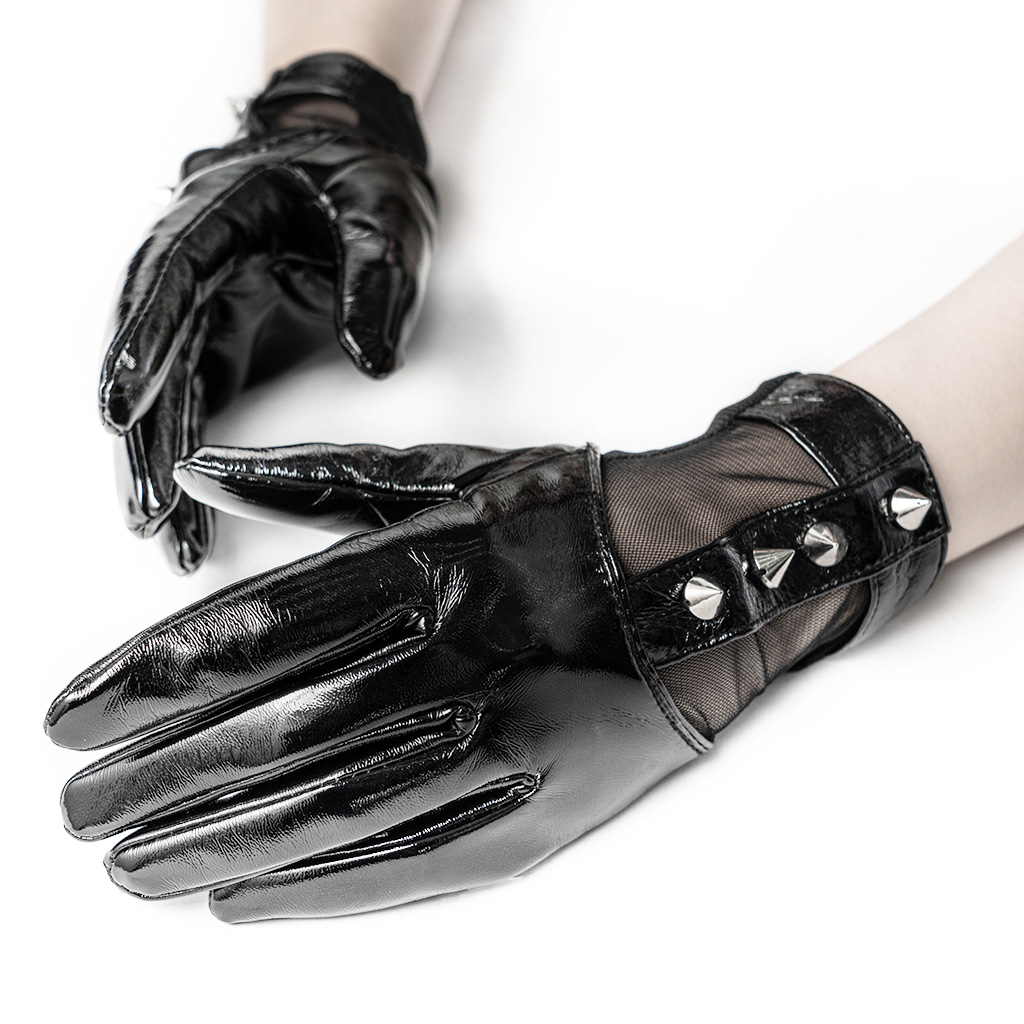 1. The main fabric is glossy paint pu 2. Glove stitching with elastic mesh fabric 3. The back of the hand is decorated with metal pointed conenails and looks handsome