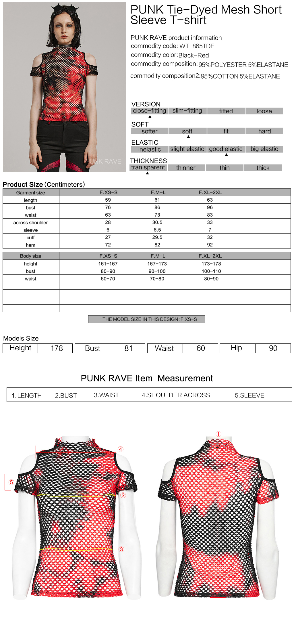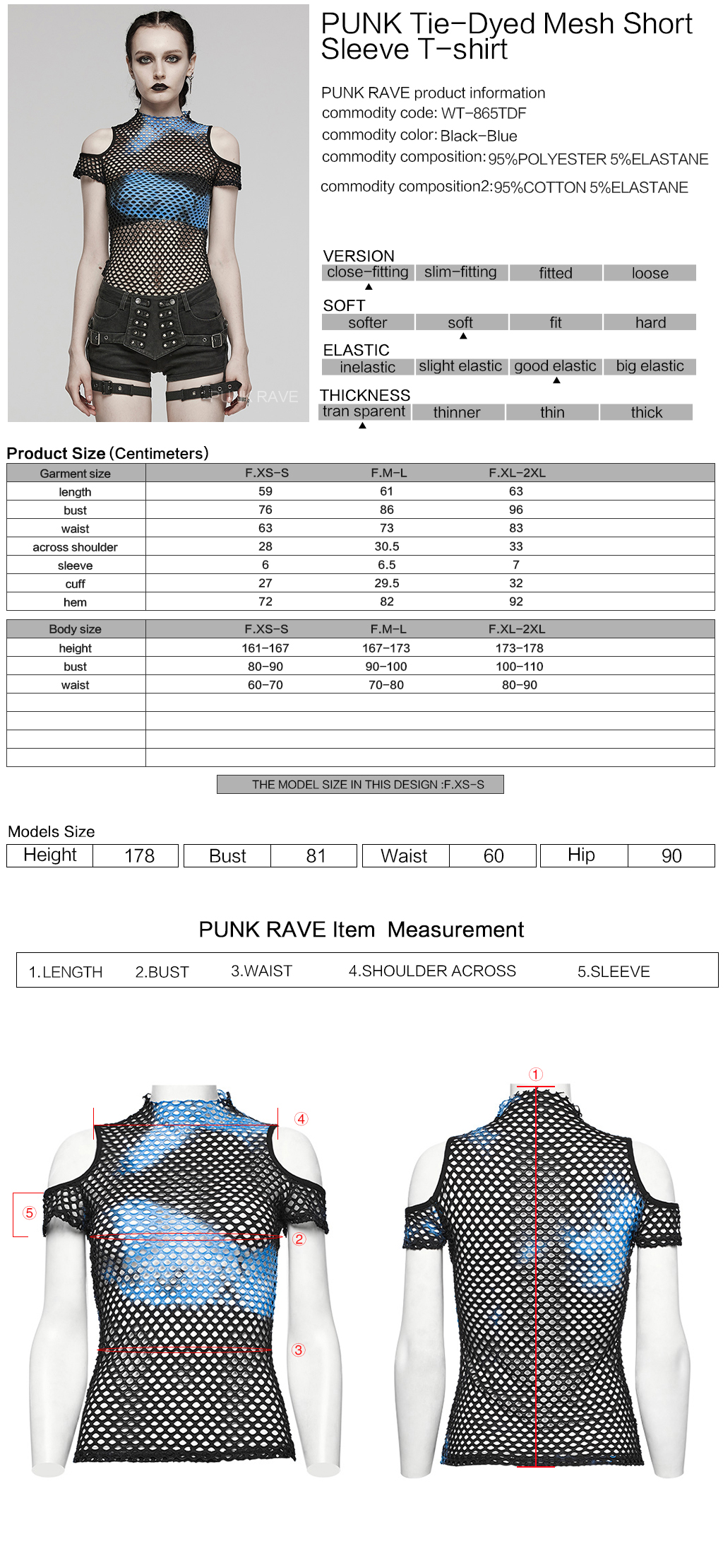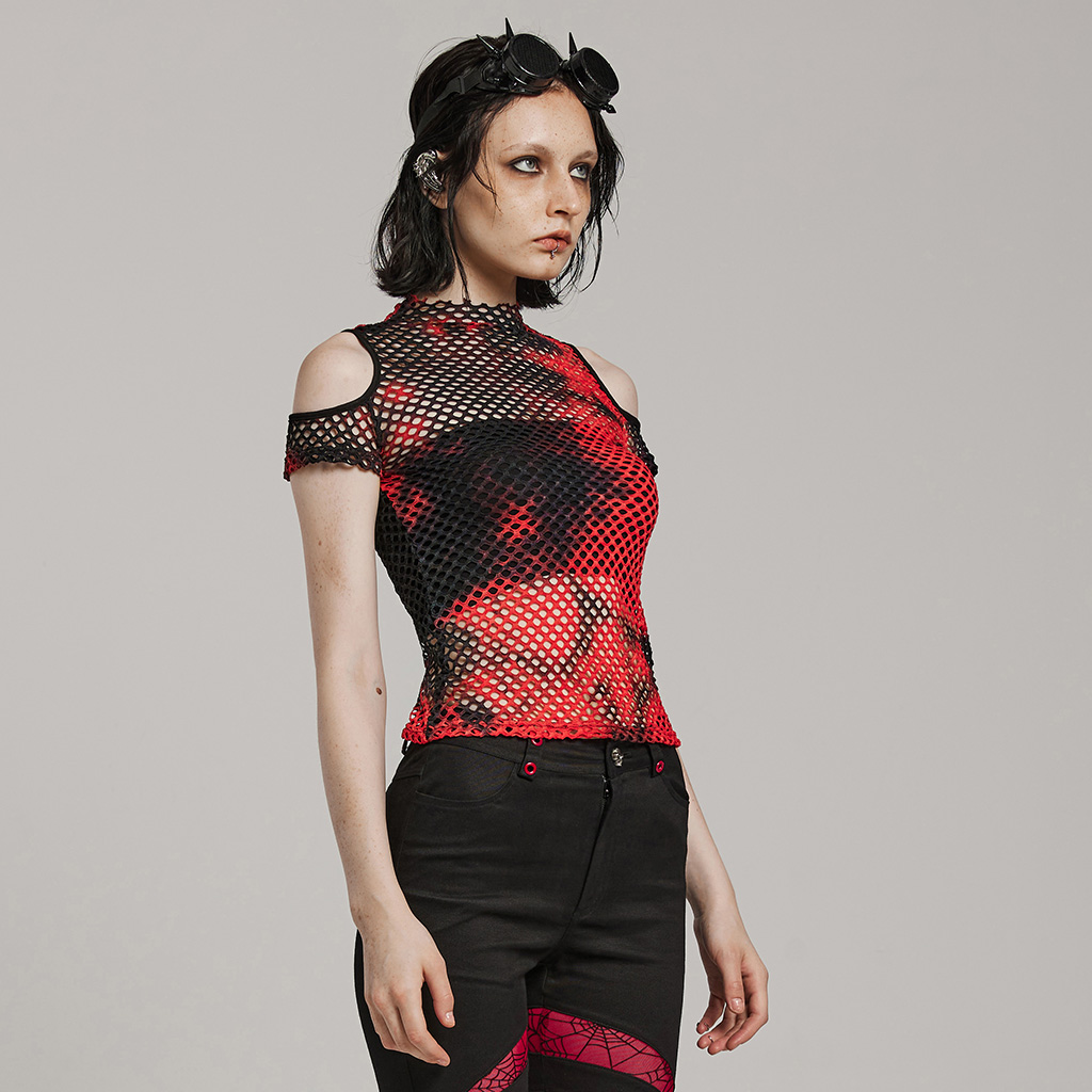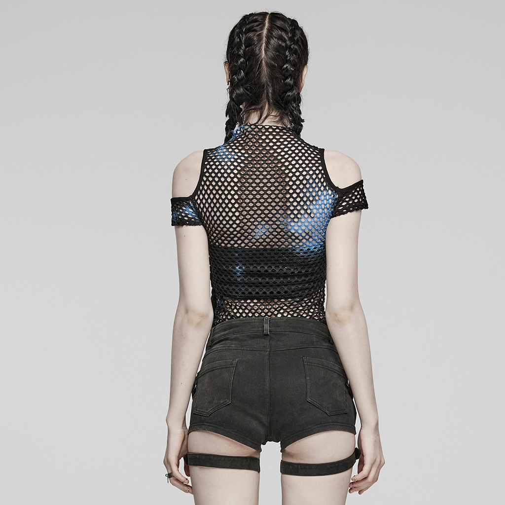Punk Rave Three Colors Available Off Shoulder And Half High Collar Basic Tee Type Punk Tie-Dyed Mesh Short Sleeve T-Shirt
